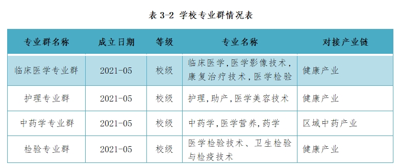 进一步加强校级专业群培育建设工作,目前,学校有校级专业群4个,省级专业群1个(中医学),逐步形成“校级-省级-国家级”三级建设体系,切实推进学校“双高计划”、“专升本”建设,努力提高学校办学水平和办学层次。