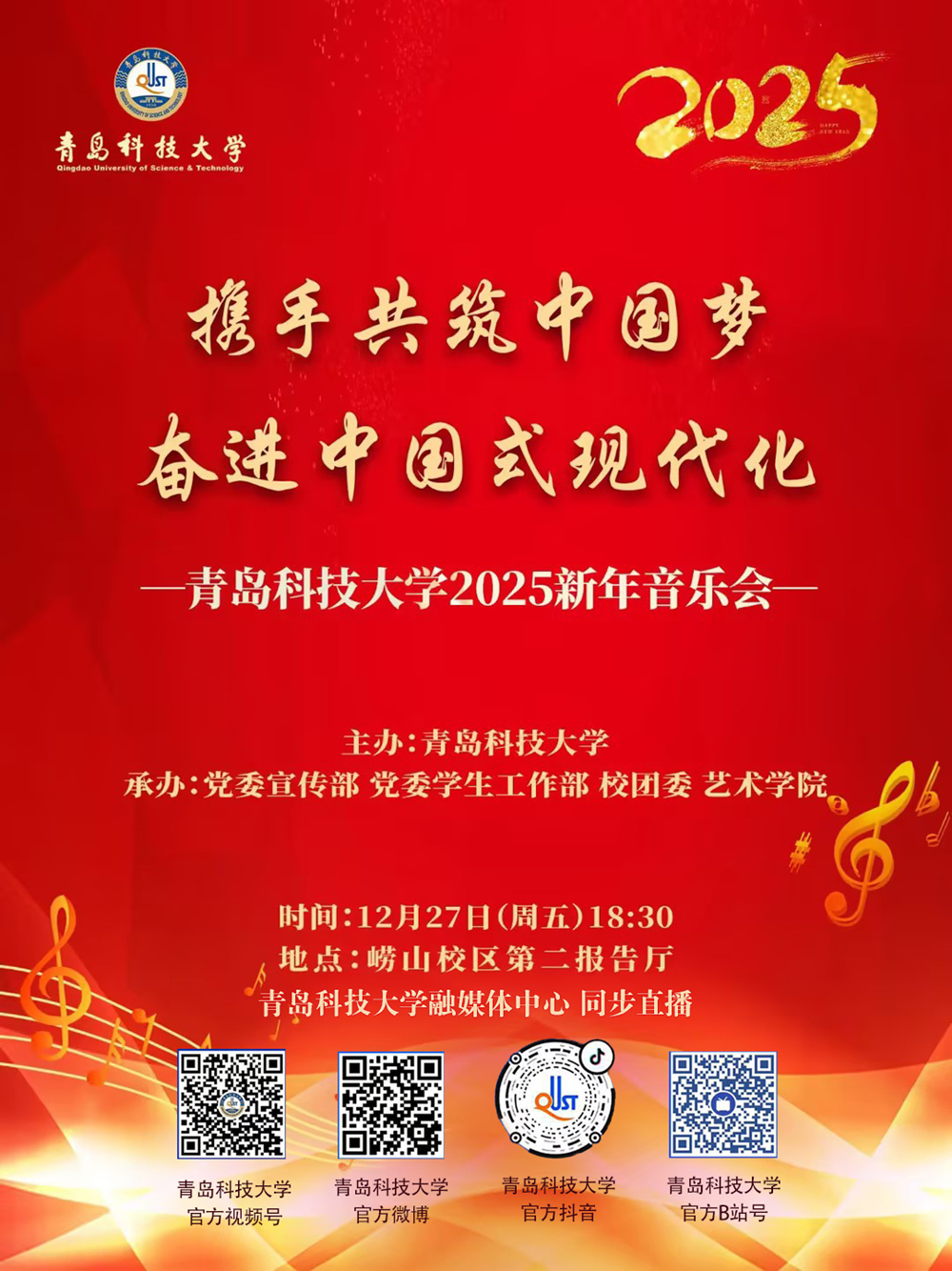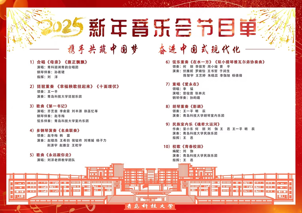 2025年新年将至,在辞旧迎新之际,学校党委宣传部、党委学生工作部、校团委、艺术学院共同承办的“携手共筑中国梦 奋进中国式现代化”伟德国际1949始于英国2025新年音乐会将在崂山校区第二报告厅精彩上演。诚挚邀请广大师生前来欣赏,一起迎接新年的到来。