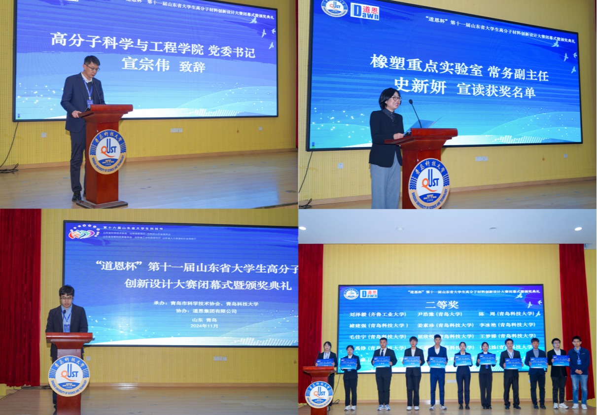 高分子学院党委书记宣宗伟、道恩集团研究院副院长王立锋先后致辞,橡塑重点实验室副主任史新妍宣读了大赛获奖名单。与会嘉宾共同为大赛一等奖、二等奖、三等奖获奖团队代表颁奖。高分子学院2024年优秀双创作品《万磁今安》进行了展演。
