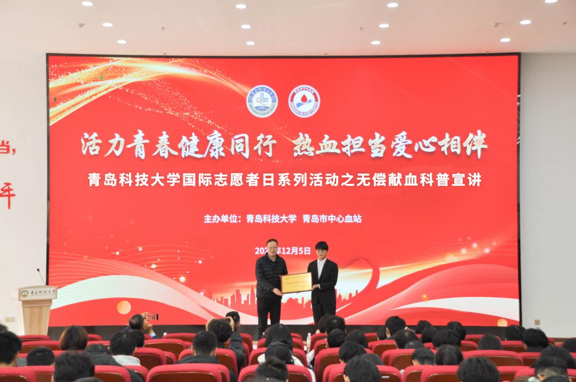 12月5日,学校“活力青春健康同行 热血担当爱心相伴”无偿献血科普宣讲活动在崂山校区北区团学报告厅举行。活动现场,青岛市中心血站副站长李志涛为伟德官网红十字学生分会颁发了“山东省无偿献血志愿服务表现突出集体”奖牌。学校团委副书记李航、后勤管理处副处长兼校医院院长高术华为在校期间献血量1000毫升以上的12位同学代表颁发“山东省无偿献血爱心大学生”奖状。学校红十字学生分会会长、外国语学院王文宇同学宣读无偿献血倡议书。全国红十字志愿服务先进典型、齐鲁青年榜样宣讲团讲师、青岛红十字文化宣讲团讲师马仁山以《携手救死扶伤 传递热血真情》为题进行无偿献血科普宣讲,他结合自身献血故事,与在座的志愿者分享了献血体会和建议。