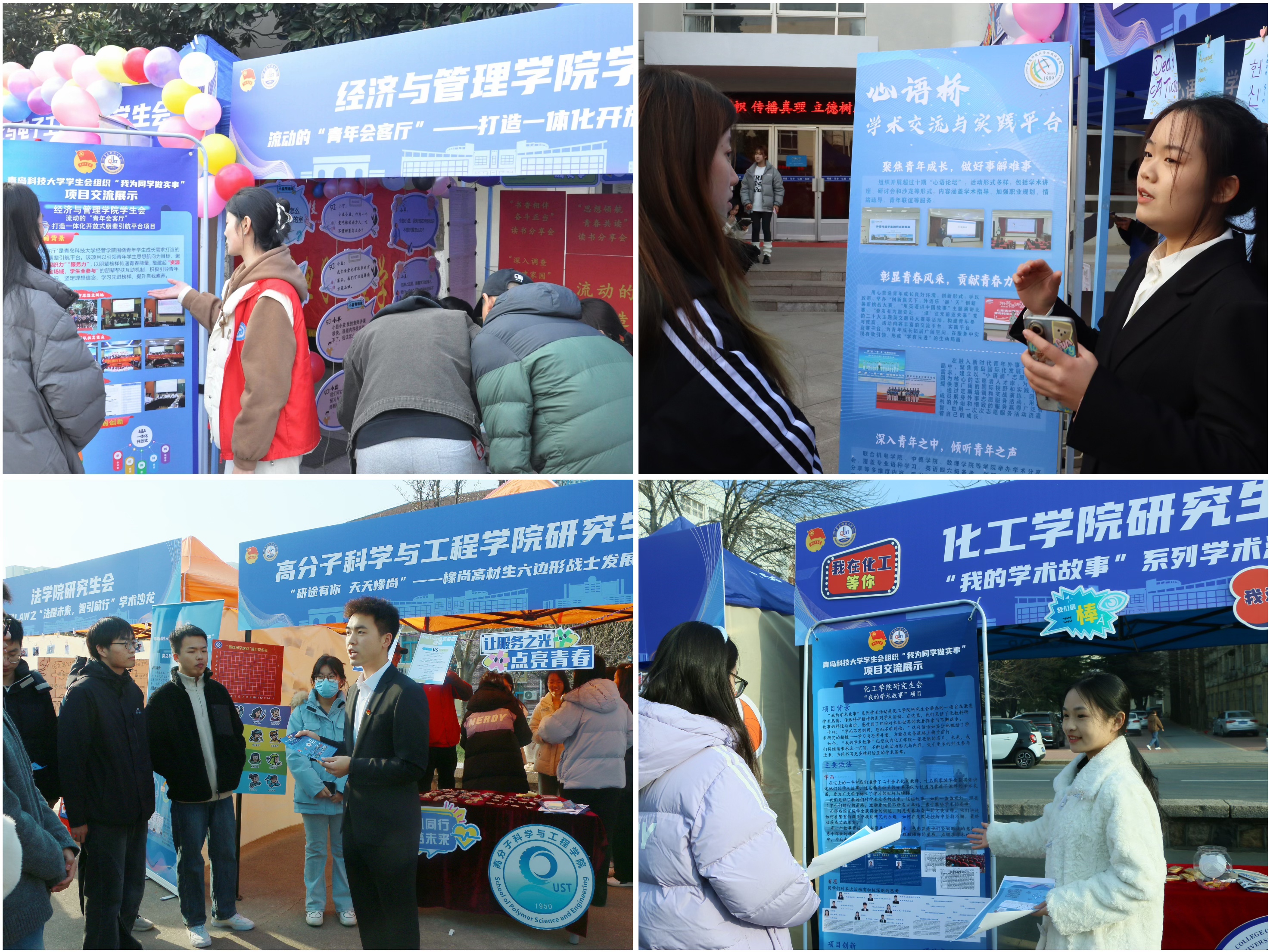 为深入贯彻落实习近平总书记关于青年工作的重要思想,全面推进“我为同学做实事”走深走实,集中展示学校学生会组织深化改革成效,12月10日,学校学生会组织2024年“我为同学做实事”项目交流活动在崂山校区弘毅广场、四方校区小五四广场举行,全校39个服务同学项目进行现场交流展示,共吸引万余名师生参与。