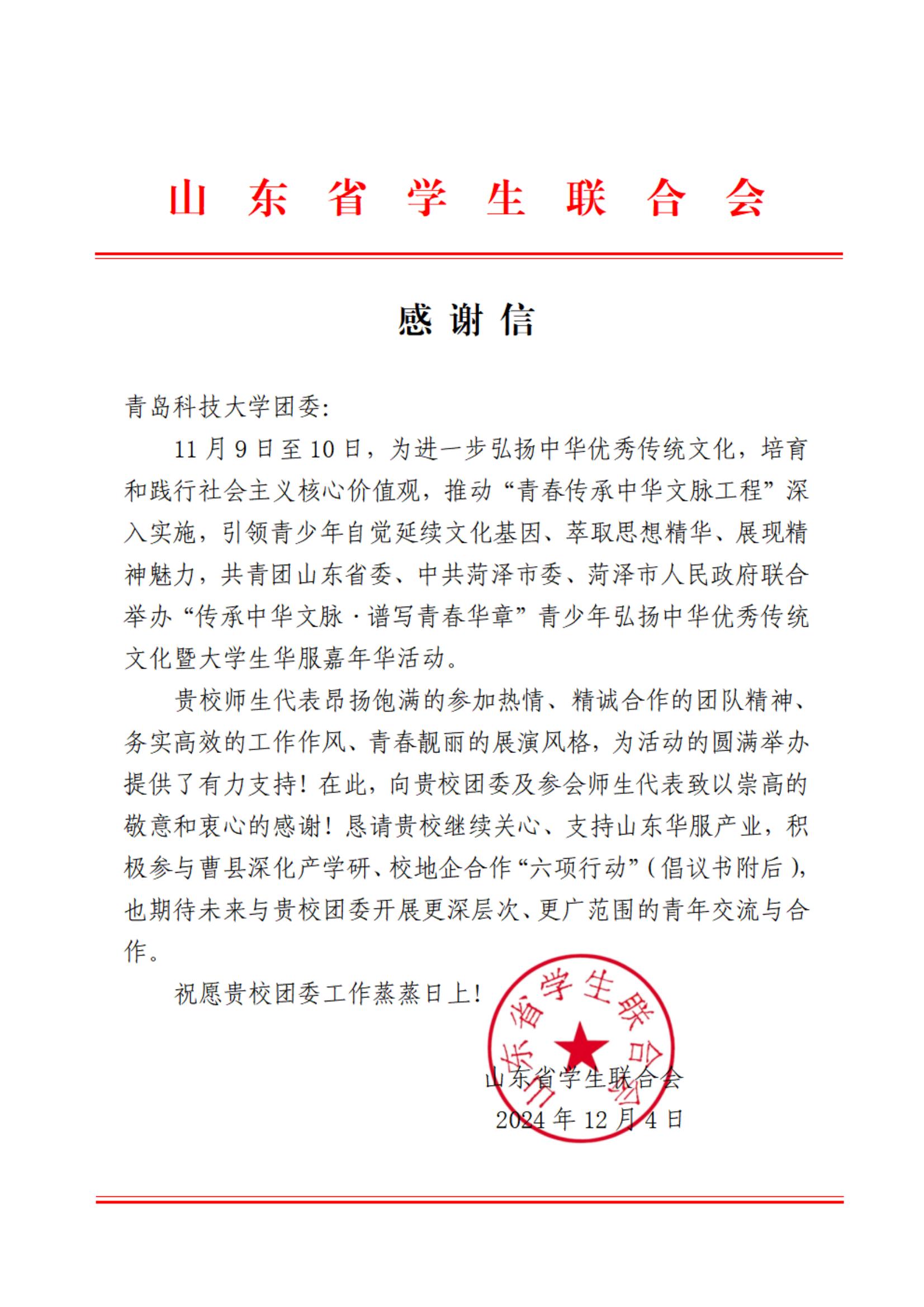 11月9日至10日,由共青团山东省委、中共菏泽市委、菏泽市人民政府联合举办的“传承中华文脉·谱写青春华章”青少年弘扬中华优秀传统文化暨大学生华服嘉年华活动在山东曹县举办。学校学生社团汉韵研习社4名成员受邀参加本次活动。近日,山东省学生联合会向伟德官网团委发来感谢信,对伟德官网师生积极参与此项活动表示感谢。