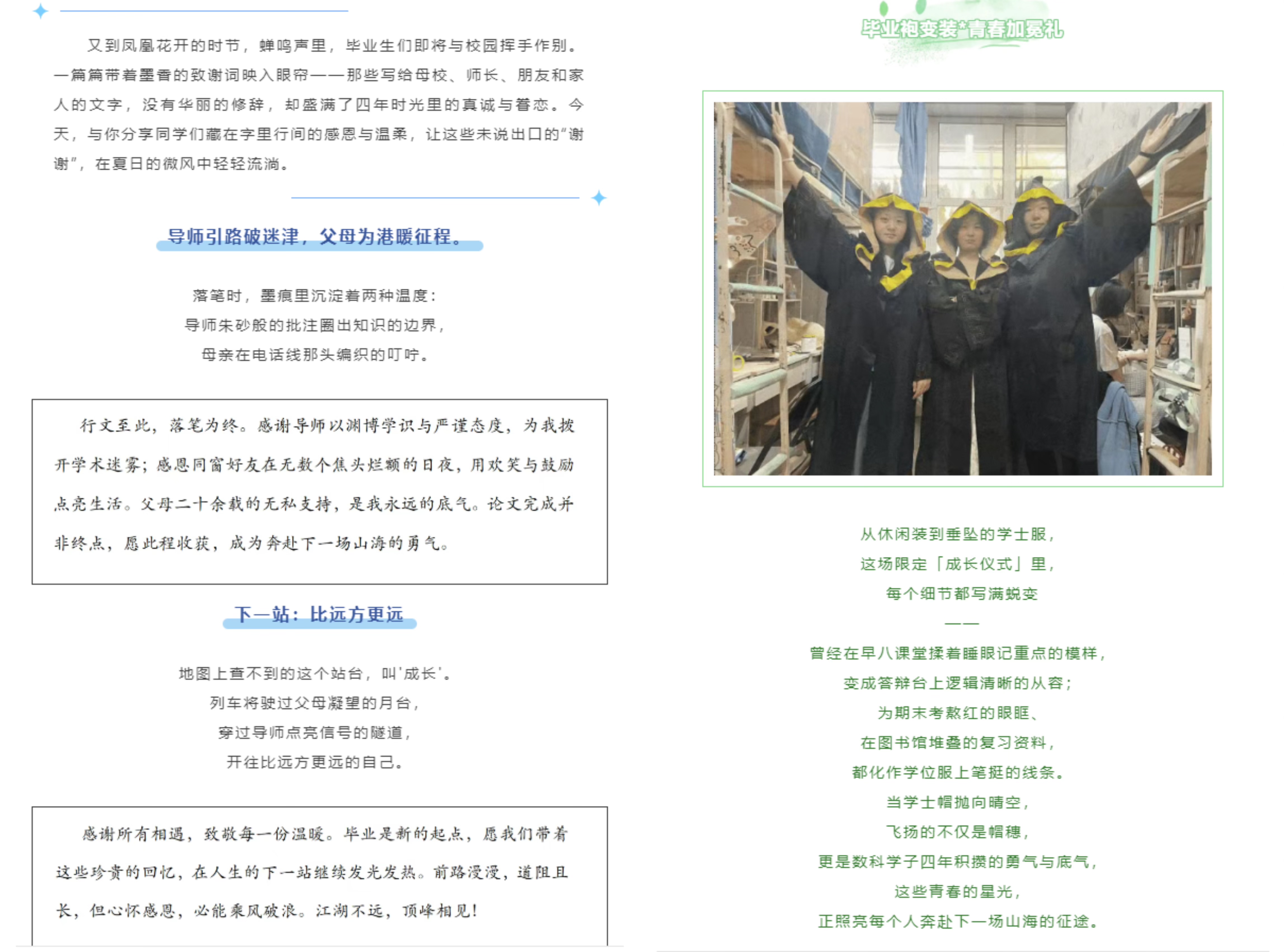 从学术赋能到情感传承,从品格塑造到记忆留存,数据科学学院的毕业季活动始终紧扣“数”与“智”的学科基因,呼应国家对数字人才“德才兼备、创新引领”的培养要求。这独特的毕业礼,正是数科院育人理念的生动注脚——让青春被温柔铭记,让梦想借“数”启航。