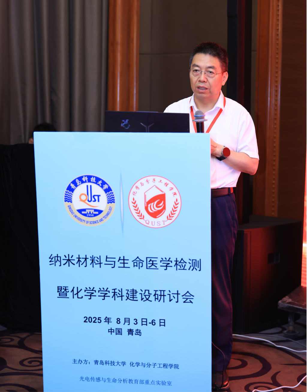 在致辞中,吕万翔代表学校对与会专家学者的到来表示热烈欢迎和衷心感谢,并介绍了学校的办学历史、发展现状和办学特色。他表示,化学是现代科学技术发展的重要基础学科,在与生命科学、材料科学等学科的交叉融合发展过程中,进一步加速了纳米医学、生命分析等领域前沿技术的发展,为人民群众生命健康提供了有力保障。近年来,学校锚定“两服务一引领”战略定位,坚持以学科建设引领学校高质量发展,立足化学、材料等学科优势特色,打造了光电传感与生命分析教育部重点实验室、生化分析山东省重点实验室等教学科研平台,持续开展电化学分析及生物传感、生命体系光谱分析等交叉领域研究,取得了一系列标志性成果,为化工、医药等产业发展持续贡献“青科大力量”。此次研讨会搭建了一个学术交流的广阔平台,欢迎与会专家学者围绕分析化学、纳米材料、生命医学等前沿领域集思广益、畅所欲言,呈现出一场主题鲜明、精彩纷呈的学术盛宴。