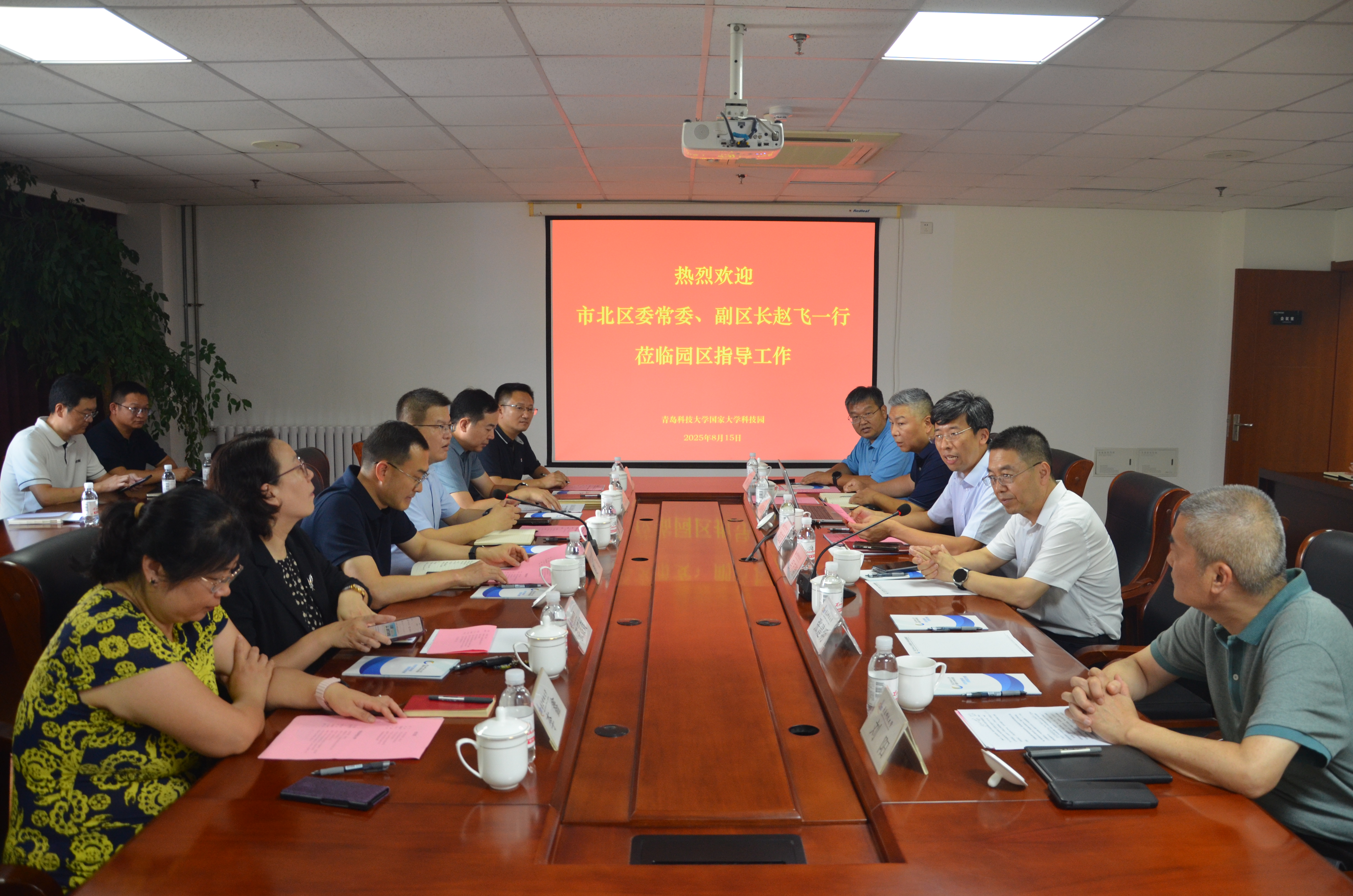 8月15日,青岛市市北区委常委、副区长赵飞率队到学校国家大学科技园调研交流政产学研融合发展工作。学校党委常委、副校长吕万翔陪同考察并出席座谈会。科技产业管理处(国家大学科技园管理办公室)处长刘志国主持会议。