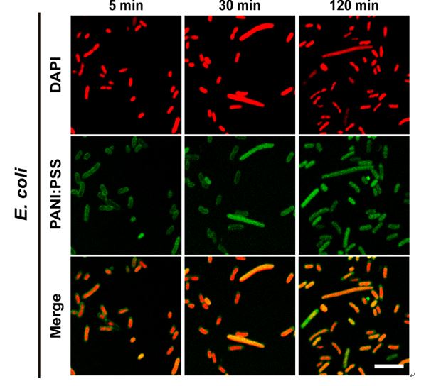 图1 DAPI染色的大肠杆菌(E. coli)与PANI:PSS共孵育5~120分钟后所拍摄的激光共聚焦显微镜照片,标尺为5 µm(该图中,红色和绿色荧光分别由DAPI和PANI:PSS发出)。