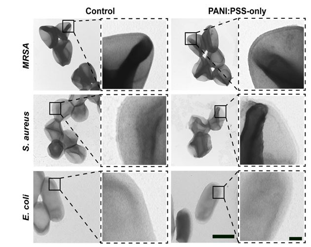 图2金黄色葡萄球菌(S. aureus)、耐甲氧西林金黄色葡萄球菌(MRSA)、和大肠杆菌(E. coli)与PANI:PSS共孵育5~120分钟后所拍摄的透射电子显微镜照片,标尺分别为1 µm(左)和200 nm(右)。