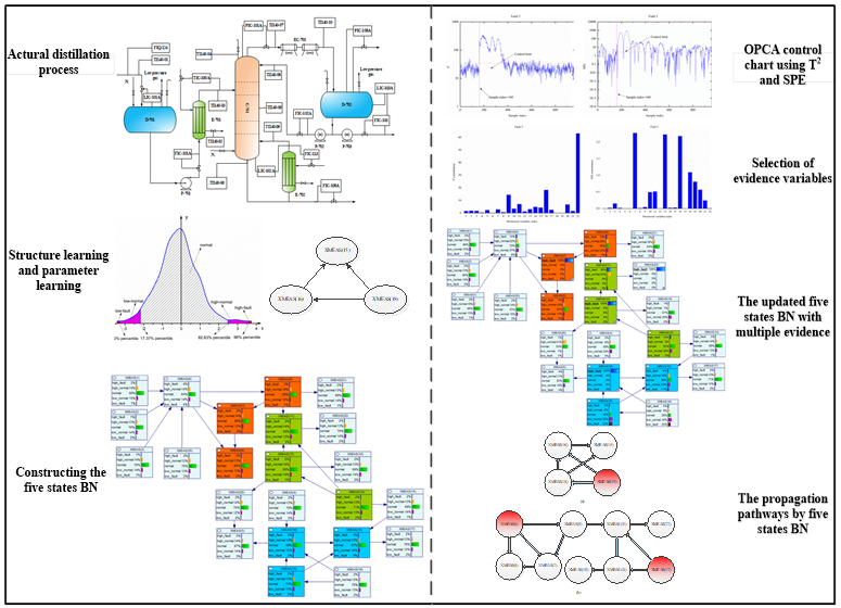 其中,文章“An intelligent quantitative risk assessment method for ammonia synthesis process”针对动态化工过程潜在风险难以预测的情况提出了一种智能的定量风险评估方法(如图1),通过深度学习技术捕捉工艺变量的深层特征,评估工况的风险等级,最终制定控制方案,保证工艺的安全运行。文章“Optimized principal component analysis and multi-state Bayesian network integrated method for chemical process monitoring and variable state prediction”针对化工企业异常工况根原因追溯困难的实际难题,提出了一种先进的过程监控方法(如图2),通过改进PCA以及构建新型多状态贝叶斯网络,做到全面的故障传播路径分析,保障化工企业的安全生产以及异常工况的提早处置。两篇文章均以伟德国际1949始于英国为第一单位,化工学院田文德教授为论文的通讯作者,博士研究生刘子健、硕士研究生柳楠分别为两篇论文的第一作者,实验室老师刘彬、李传坤、崔哲参与指导工作。