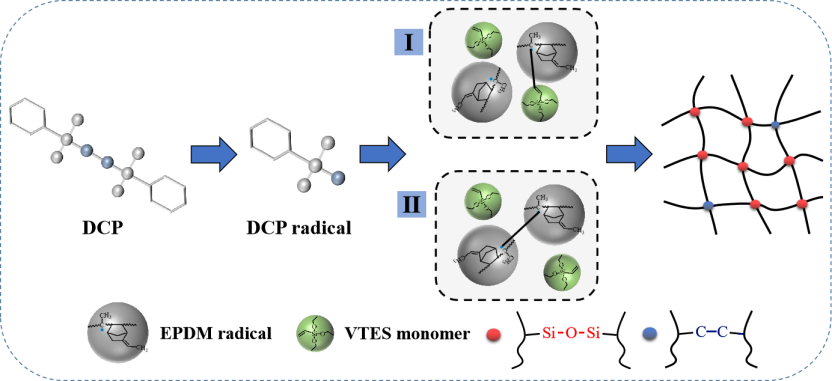 交联(硫化)是橡胶加工经历的必需过程,它使分子链通过化学键连接成三维网络结构,赋予橡胶高弹性以及提升其强度、热稳定性等性能。目前有多种交联三元乙丙橡胶(EPDM)的方法,如硫黄交联、过氧化物交联、树脂交联。但都存在不足,如硫黄喷霜、交联键键能低造成的硫化返原、过多的过氧化物易导致EPDM降解(β断裂)以及树脂交联效率低等。相比于其它交联方法,湿气交联具有环境友好与低成本的优点,并且适用于连续化生产。