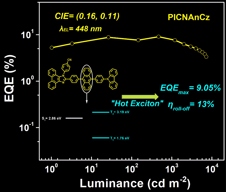 有机电致发光二极管(OLED)作为新一代信息显示技术的生力军,在高端显示领域已展现出巨大的应用前景。而目前制约OLED发展的关键因素之一是综合性能优异的蓝光材料的缺乏。尽管蓝色磷光材料,热活化延迟荧光材料,在器件效率上已经实现了很大突破,但是在纯蓝有机荧光材料开发上,还面临很大挑战,而且器件的稳定性与实际的工业应用仍有较大差距。因此,发展集高效率、低效率滚降、高色纯度等优异的综合性能一体的纯有机蓝光材料与OLED器件仍具有很大挑战。