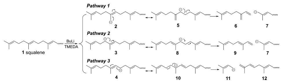 图2总结了以顺丁橡胶、高乙烯基聚丁二烯、聚异戊二烯和天然橡胶作为底物降解后产物的分子量变化。其中顺丁橡胶降解最为彻底,产物最低分子量约1400,其余橡胶也发生了明显的降解,但降解程度略有不同。降解反应的主要产物为末端具有共轭双键的低聚物,结合2H同位素标记和2H NMR光谱分析阐明了降解过程中碳负离子中间体的结构。根据对降解过程和产物的跟踪表征,课题组提出了可能的反应机理(图3),即烯丙基碳负离子发生共振和重排的过程,导致 C-C 键断裂并在链末端产生具有共轭双键的产物。该机理也得到了DFT计算的支持,通过计算,此降解被认为是为熵驱动的过程。