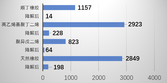 图2.不同橡胶在降解前后分子量的变化(数值为数均分子量,单位为1×102 Da)