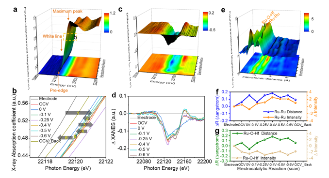 本文通过设计、制备Ru纳米颗粒与宽带系HfO2的复合催化材料Ru/HfO2,扣除HfO2和导电碳HER性能的直接贡献,来确定Ru自身活性。原位XAS结合理论计算研究表明,Hf-O-Ru与O空穴协同提高了HER性能,Ru/HfO2质量活度比商业Pt/C提升了20倍。