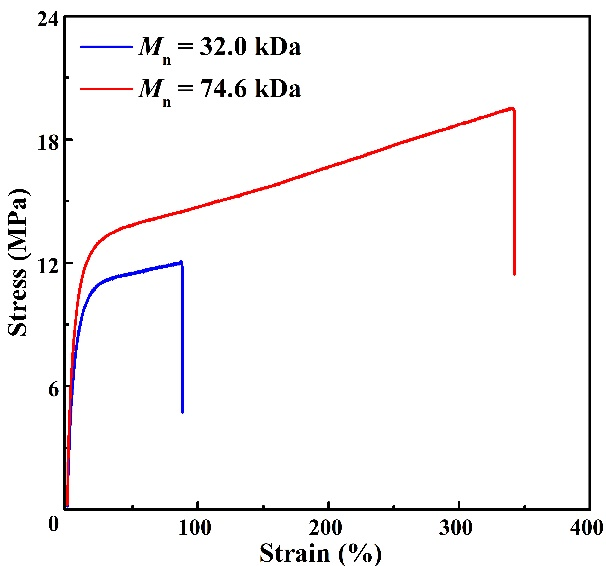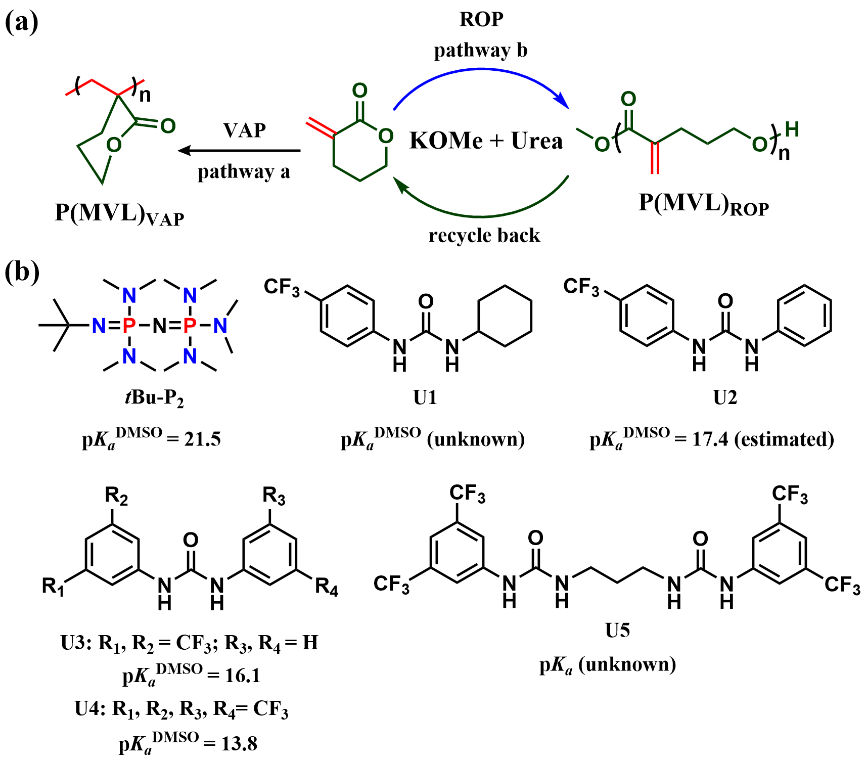 α-亚甲基-δ-戊内酯(MVL)可以由生物质来源的δ-戊内酯(δVL)与甲酸乙酯通过两步反应简单制备。作为一种双官能团环内酯单体,之前的研究集中于MVL的环外双键加成聚合(VAP,pathway a),而通过开环聚合制备可回收聚酯仍然是一个挑战(ROP,pathway b)。在前期工作的基础上,伟德国际1949始于英国沈勇副教授和李志波教授通过使用强碱与一系列具有不同结构和pKa值的脲构筑二元催化体系,成功实现了MVL的化学选择性开环聚合,聚合呈现“活性”/可控聚合特性,所得聚合物端基、分子量及分子量分布可控。使用有机磷腈碱tBu-P2与二元脲U5为催化剂时,制备得到的聚酯P(MVL)ROP分子量高达74.6 kDa。值得注意的是,高分子量P(MVL)ROP表现为韧性塑料,其力学性能与商品化的等规聚丙烯(PP)和低密度聚乙烯(LDPE)相当。此外,通过硫醇-烯“点击化学”反应可以对P(MVL)ROP侧基的双键进行后修饰,进一步调控聚酯的性质。