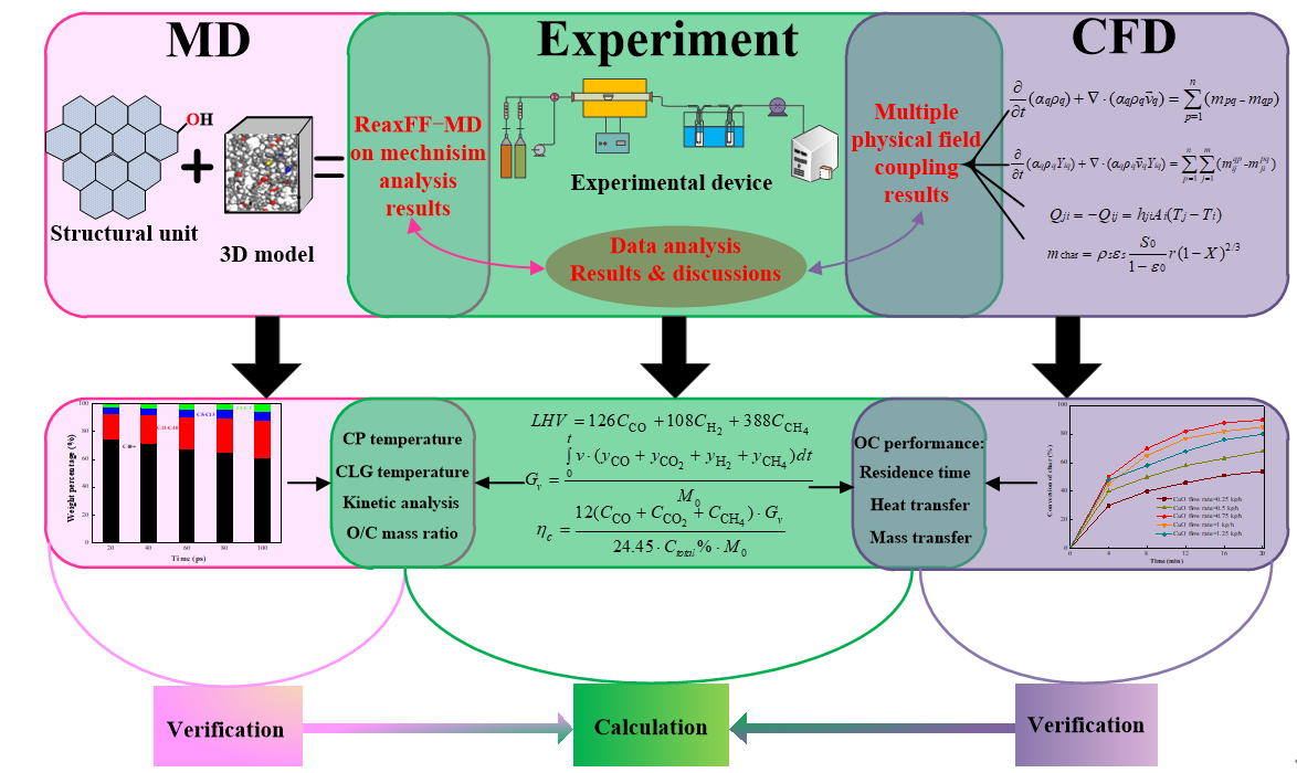 文章分别提出了基于新型协同萃取剂微观机理分析的高浓度含酚废水处理动态控制与优化策略(如图1)和基于多尺度模拟与实验测试的煤化学链气化过程全局优化策略(如图2)。从微观到宏观、从模拟到实验的多维研究体系极大程度保证了研究结果的可靠性和可行性,为实际化工装置的污染物处理与减排提供理论指导。该进展的相关文章均以伟德国际1949始于英国为第一单位,田文德教授和团队教师崔哲分别为两篇论文的第一作者,博士研究生李哲为第二作者(导师一作)。