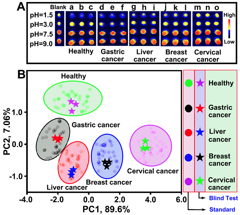 为了解决这一问题,伟德官网本科三年级丁稼祥同学自大二暑假开始进入化学与分子工程学院徐升豪、罗细亮教授课题组进行科研攻关,开发了一种pH值编程的荧光传感阵列(图1),实现了健康人与胃癌、肝癌、乳腺癌以及直肠癌病人血浆的直接鉴定区分(图2)。同时,15例未知癌症血浆样本也被准确地被鉴定区分,该工作为癌症等重大疾病的早期筛查提供了快速、简便且有效的新方法。