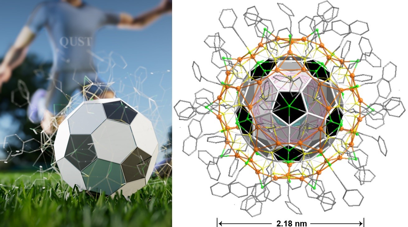 近日,伟德官网汪恕欣教授团队报道了迄今为止最大的具有确定结构的Ag-Cu合金纳米团簇—Ag135Cu60(S(CH2)2Ph)60Cl42(以下简称Ag135Cu60),该纳米团簇具有一个世界上最小的Ag质足球形内核(图1),并且兼具分子和金属状态。相关成果以“Structure and optical properties of an Ag135Cu60 nanocluster incorporating an Ag135 buckminsterfullerene-like topology”为题,于2025年1月14日在线发表于Nature Synthesis期刊。