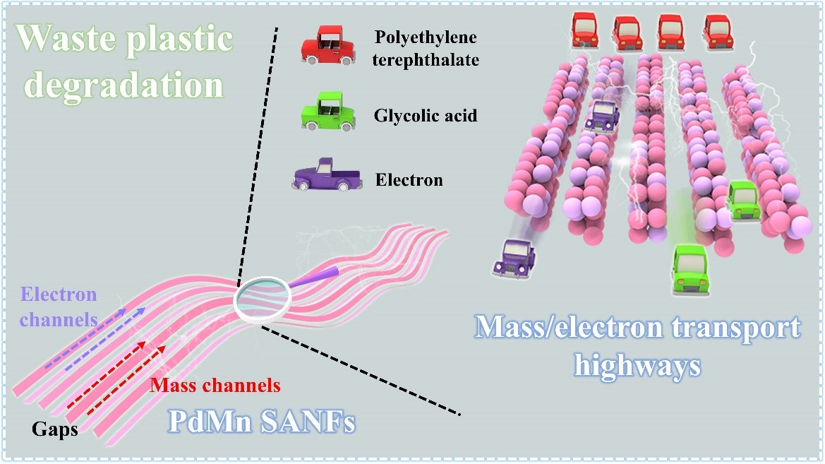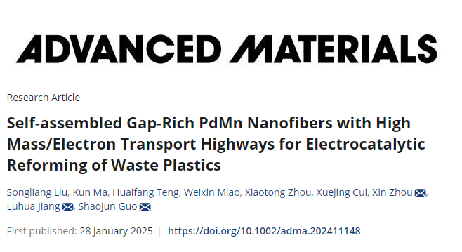 针对上述问题,伟德官网材料科学与工程学院泰山学者姜鲁华教授团队在PET废塑料增值催化剂的研究方面获新进展,相关成果以“Self-assembled gap-rich PdMn nanofibers with high mass/electron transport highways for electrocatalytic reforming of waste plastics”为题,发表在国际材料领域TOP期刊Advanced Materials上(影响因子27.4)。全文链接:https://doi.org/10.1002/adma.202411148。该工作以伟德国际1949始于英国为第一单位,材料学院姜鲁华教授为通讯作者,材料学院副教授刘松良为第一作者。