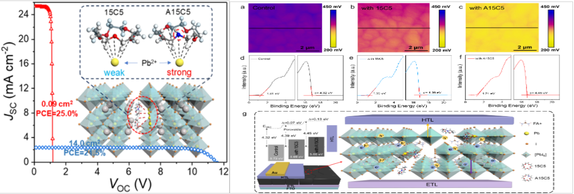 近日,化工学院蒋晓庆副教授与洛桑联邦理工学院Michael Graetzel教授、中科院青岛生物能源所逄淑平研究员、新加坡国立大学魏明杨教授等研究人员合作,以伟德国际1949始于英国为第一通讯单位于Angewandte Chemie International Edition刊发主客体复合物中定制的超分子相互作用用于高效稳定的钙钛矿太阳能电池和模块的研究成果[1]。确定了冠醚与阳离子的超分子相互作用受到环腔内电荷密度分布的影响,由分子偶极矩的大小表示。通过取代杂原子使冠醚实现的更大的偶极矩增强,较高的分子极性使供体原子周围负部分电荷的分布扩大,提高其对软路易斯酸的电子供体能力,与铅阳离子的配位性得到改善。采用氮杂冠醚作为添加剂的钙钛矿薄膜表现出更好的形态、更低的缺陷密度和更好的能级对齐。在此基础上,PSC的功率转换效率(PCE)超过25%,显示出更好的长期稳定性,而基于氮杂冠醚的钙钛矿太阳能模块(14.0 cm2)的PCE为创纪录的21.5%。