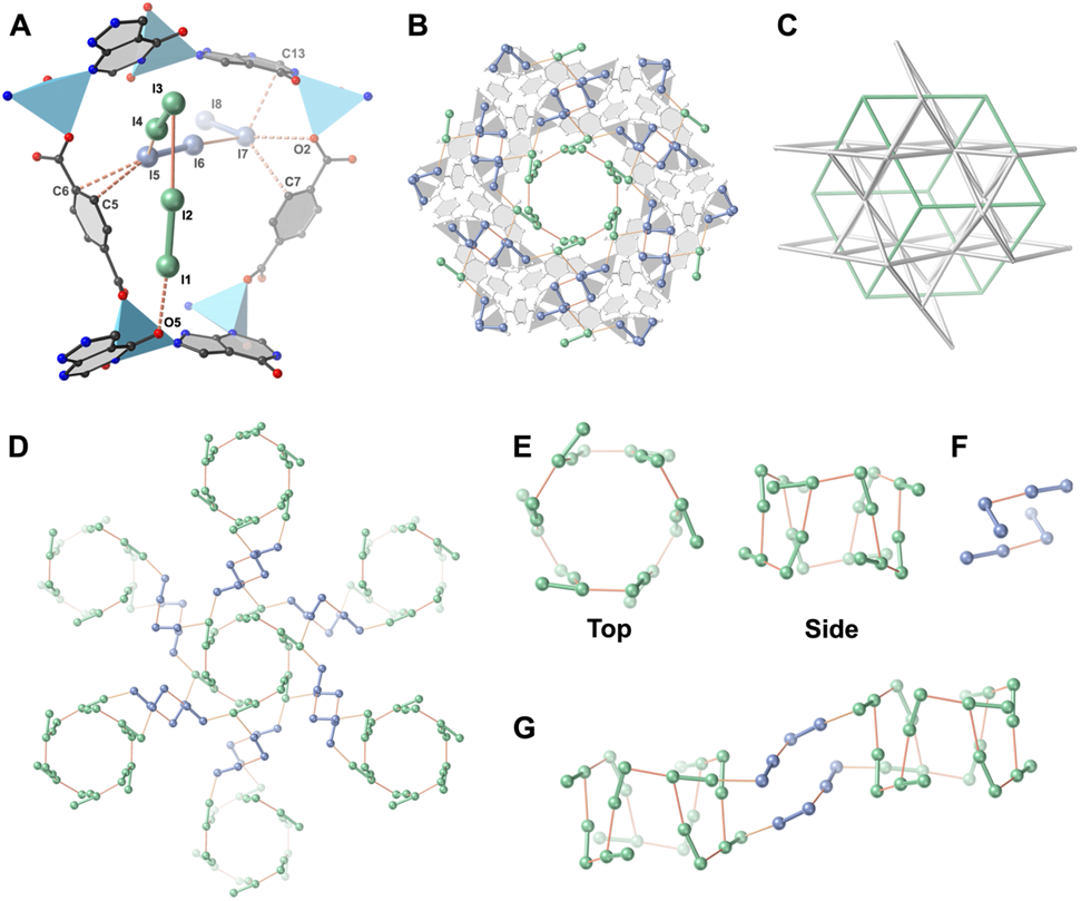 在ALP-MOF-1中,吸附的碘分子完全被其三维交联的孔道几何结构限域,形成了一种独特的三维聚集态碘网络结构。这与MFM-300(Sc)中的一维三螺旋碘链以及常温下二维固态碘结构截然不同。