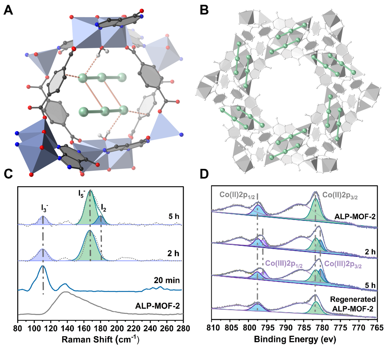 图3. ALP-MOF-2中限域的I₃⁻的晶体学结构及拉曼、XPS光谱表征。