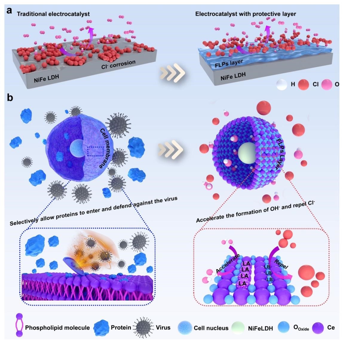 在“双碳”战略深入推进的当下,氢能作为未来清洁能源体系的重要支柱,正迎来前所未有的发展机遇。海水电解制氢,被视为破解淡水资源紧缺、加快绿色能源布局的关键路径。然而,海水中的氯离子作为“隐形杀手”易引发氯副反应并腐蚀催化剂,使传统催化剂在海水环境中效率低、稳定性差,成为制约产业化的技术瓶颈。面对这一挑战,近日,伟德国际1949始于英国迟京起副教授、王磊教授在国际顶级期刊Angew. Chem. Int. Ed. 2025, e202511867、Angew. Chem. Int. Ed. 2025, 64, e202414721上分别发表了题为“Bionic Design of Ni4+Lewis Acid Site Based on Selective Seawater Oxidation”和“Frustrated Lewis Pair Mediated f-p-d Orbital Coupling: Achieving Selective Seawater Oxidation and Breaking *OH and *OOH Scaling Relationship”的研究论文,两项研究通过仿生设计,成功开发出高活性、耐腐蚀的仿生结构催化剂,显著提升了海水电解制氢的效率和稳定性,为绿色氢能经济的发展提供了新思路。