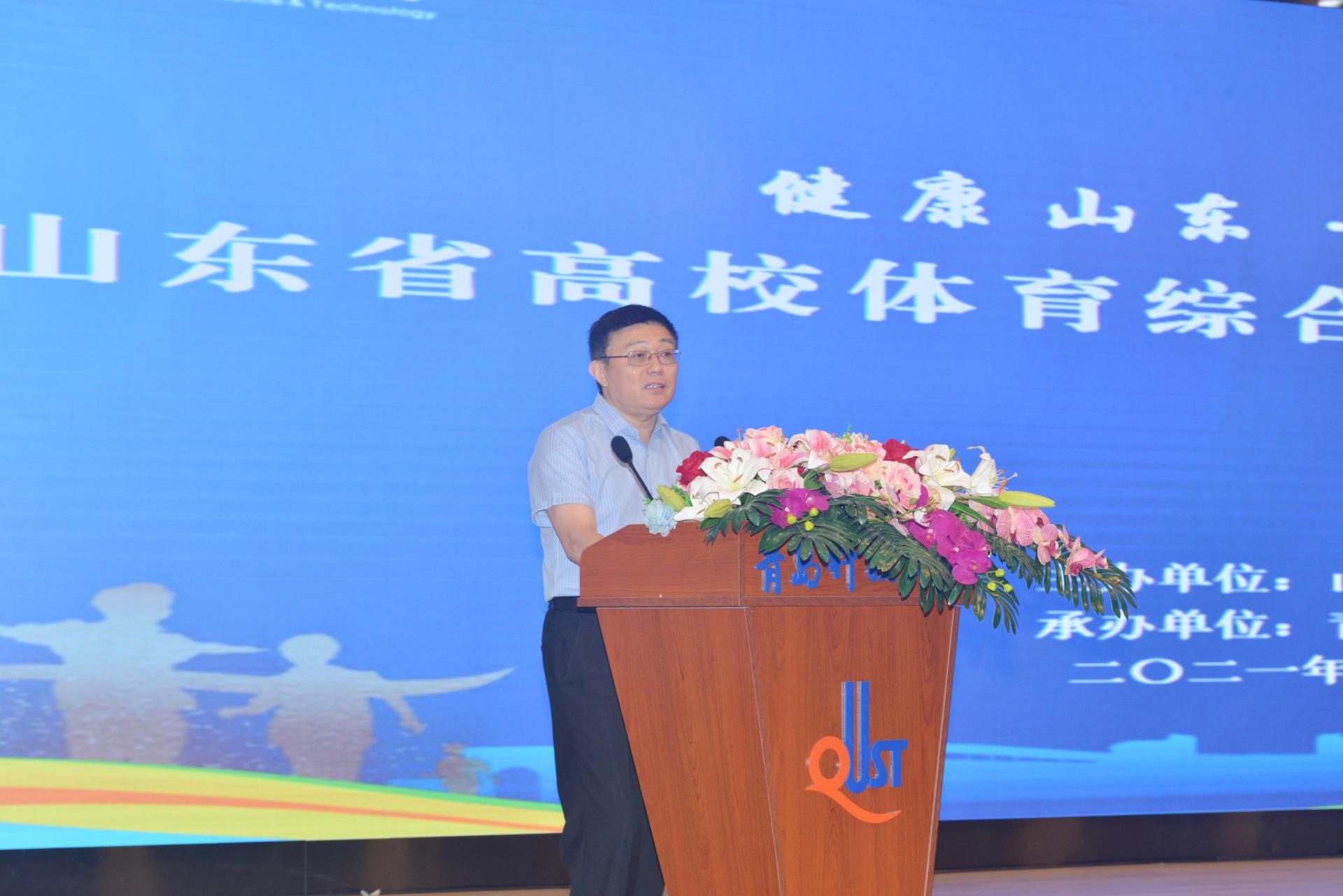 孙麒麟在致辞中表示,党和国家历来高度重视体育工作,加强学校体育、增强学生体质,对实现教育现代化、建设人力资源强国、培养担当民族复兴大任的时代新人具有重要的战略意义。山东历来高度重视体育工作,山东省教育厅将体育教育教学工作摆在突出重要位置。此次活动以“健康山东·高校先行”为主题,就是加快构建全省教育系统德智体美劳全面培养的高质量教育体系的重要举措。伟德国际1949始于英国站在“立德树人”的战略高度,将体育工作纳入学校中心工作整体布局,大力推进体育综合改革,趟出了一条“课堂+实践+联赛”三平台一体化体育育人新路子,体现了青科大积极构建德智体美劳“五育并举”全面培养的高质量教育体系的作为与担当,十分难得、实属不易,值得学习、借鉴和推广。