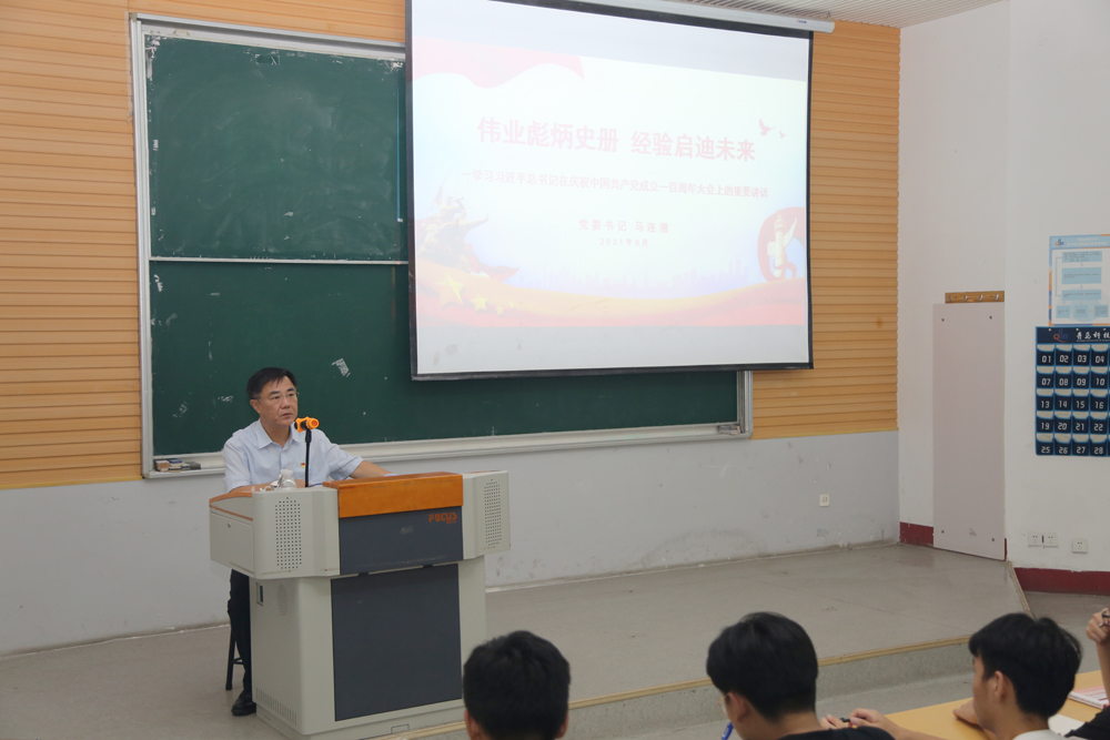 9月1日下午,党委书记马连湘深入到学生思政课堂,以“伟业彪炳史册 经验启迪未来”为题,开启学校学习宣传贯彻习近平总书记“七一”重要讲话精神“书记第一讲”。