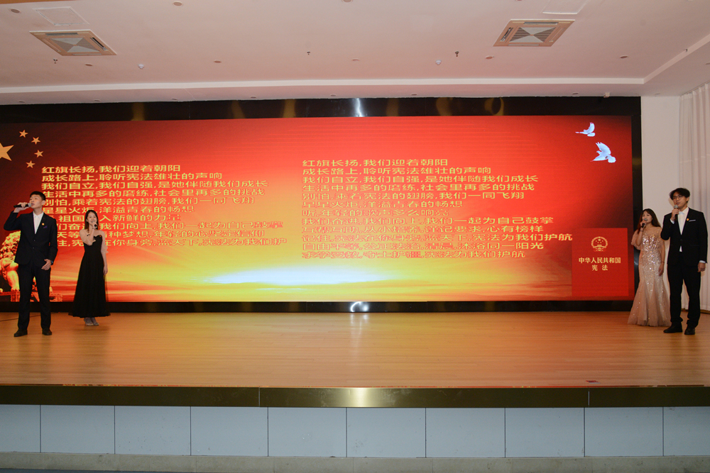 全体师生合唱《宪法伴我们成长》歌曲,优美激昂的旋律渗透着宪法知识,大家用心体会宪法的神圣,表达对宪法的敬意。