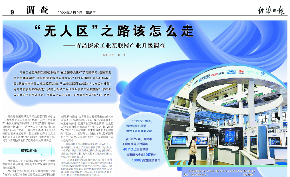 3月2日,《经济日报》第9版以《“无人区”之路该怎么走——青岛探索工业互联网产业升级调查》为题,整版报道了青岛工业互联网学院建设有关情况,报道摘要如下: