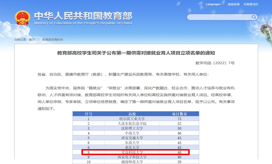 日前,教育部发布了《关于公布第一期供需对接就业育人项目立项名单的通知》(教学司函〔2022〕7号),伟德官网就业育人项目立项40个,立项总数在全国立项成功的1268所高校中排名第8位,在山东省内所有高校中排名第1位。