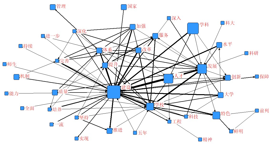 通过图1的词云图可以看出,建设、学科、发展、人才、特色、治理等词汇是大会报告中权重较大的,关键词词云图分析结果比较充分地展示了学校党代会报告的核心概念。