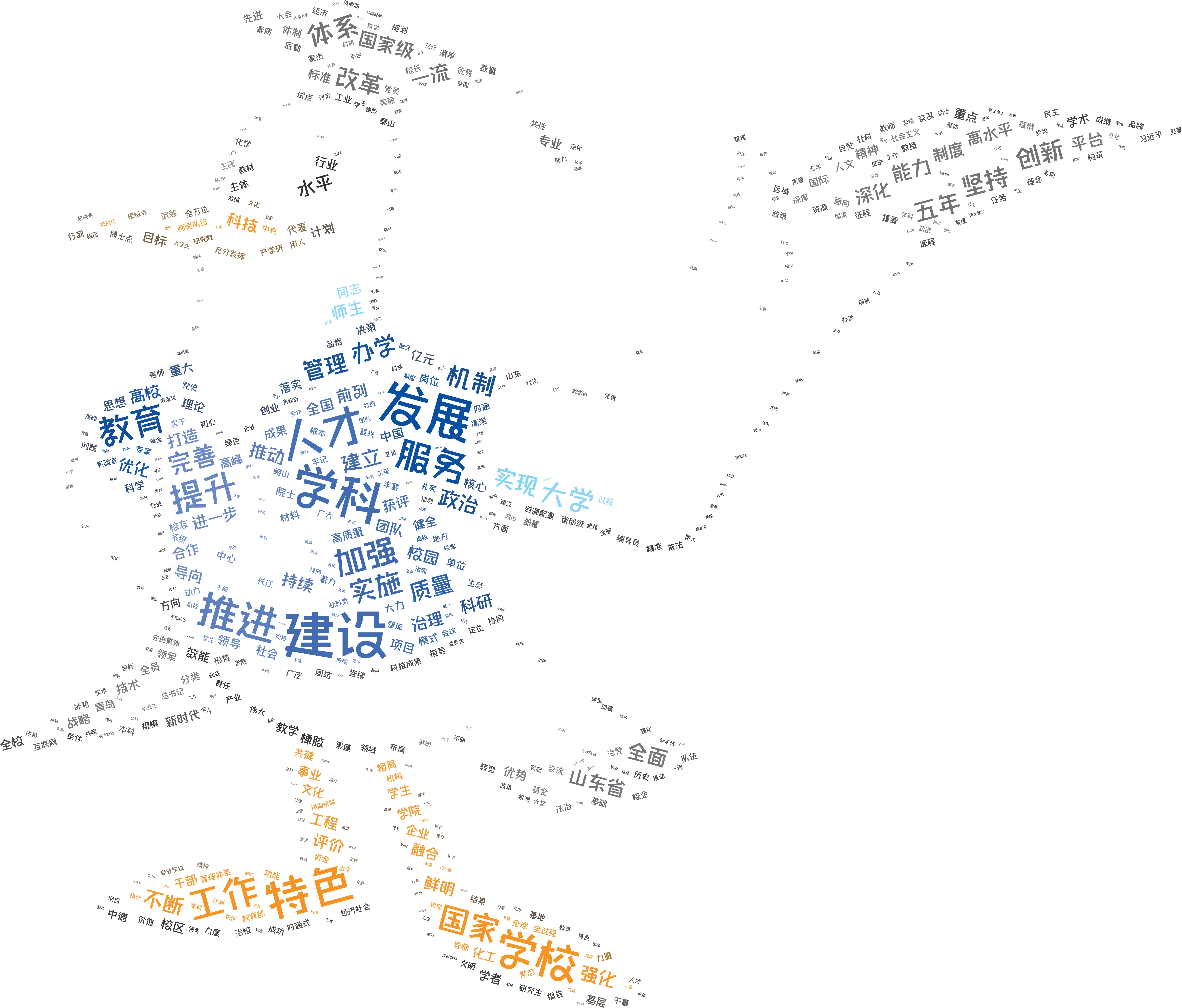 通过表2和图6可以看出,今后将以建设、学科、发展、人才、特色、治理等为主要努力方向。