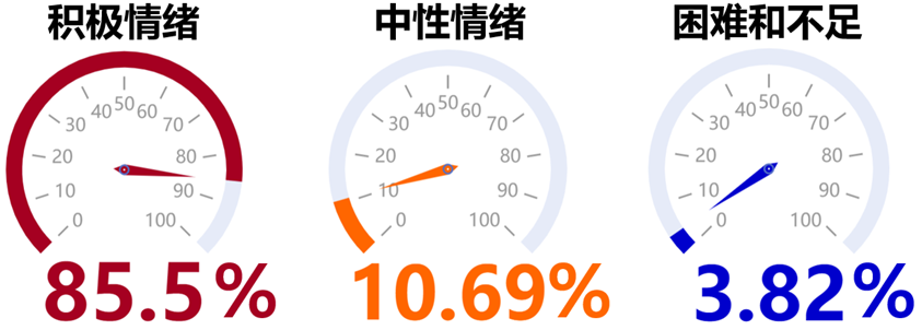 通过图4可以看出,整篇报告结构合理,涉及到困难与不足约占3.82%,规划蓝图、奋斗目标、对策举措、鼓足干劲的部分占了85.50%,其他中性描述性词汇占比10.69%。整篇文档符合“二八理论”,是一篇十分合理的报告。