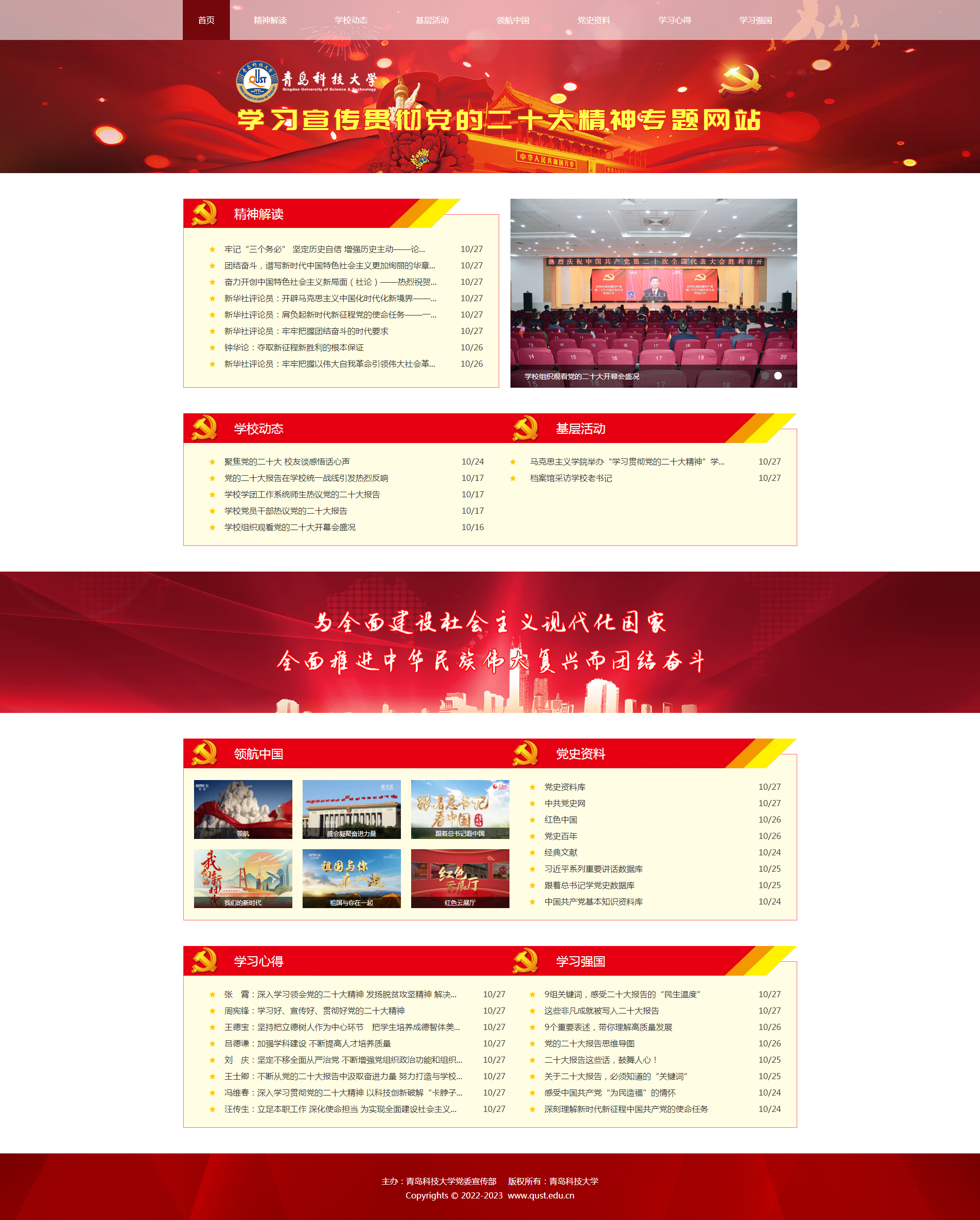 网站分为“精神解读”“学校动态”“基层活动”“领航中国”“党史资料”“学习心得”“学习强国”共七个版块。其中,“精神解读”重点发布党的二十大报告以及权威媒体关于党的二十大精神的理论文章、专家观点、政策解读、理论评论等内容;“学校动态”重点发布学校学习宣传贯彻党的二十大精神的重要新闻;“基层活动”重点发布学校各基层单位学习宣传贯彻落实党的二十大精神相关活动新闻;“领航中国”重点发布国家级媒体制作的与党的二十大精神相关的视频作品;“党史资料”重点发布中国共产党历史相关资料;“学习心得”重点发布学校广大师生校友热议党的二十大报告和学习宣传贯彻党的二十大精神的体会心得;“学习强国”重点发布学习强国平台及其他中央重点媒体关于党的二十大的重要内容。