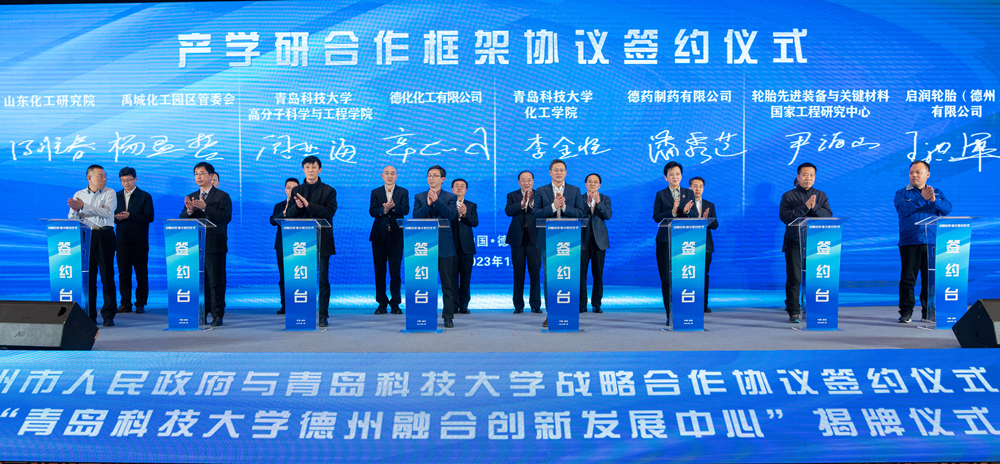 山东化工研究院、高分子科学与工程学院、化工学院、轮胎先进装备与关键材料国家工程研究中心、生态化工省部共建国家重点实验室培育基地、橡塑材料与工程教育部重点实验室、机电工程学院等单位与德州市8家企业签署产学研战略合作框架协议。