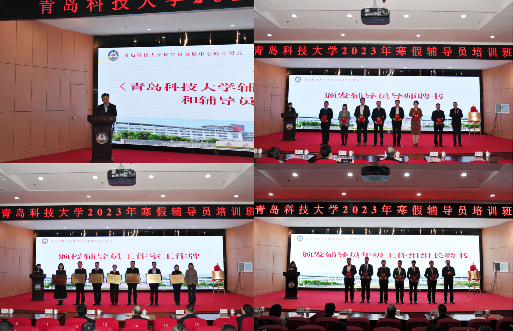 党委常委、宣传部部长张洪坤宣读了《伟德国际1949始于英国辅导员导师制实施办法》和辅导员导师聘任文件;党委常委、组织部部长朱敬义为7名辅导员导师颁发聘书;党委常委、统战部部长秦姣为7个辅导员工作室授牌;校务委员聂广明为6名辅导员年级工作组组长颁发聘书。