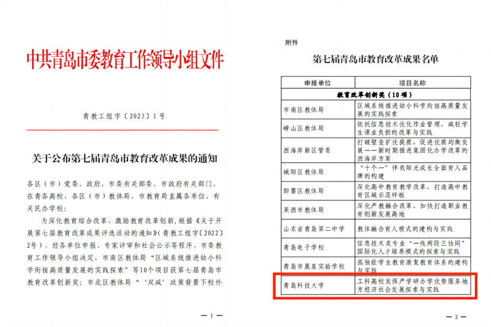 近日,第七届青岛市教育改革成果评选结果公布,由学校研究室(高等教育研究所)总结提报的成果《工科高校发挥产学研办学优势服务地方经济社会发展探索与实践》获评第七届青岛市教育改革创新奖,这是驻青高校唯一获奖成果,也是伟德官网首次获评青岛市教育改革成果。