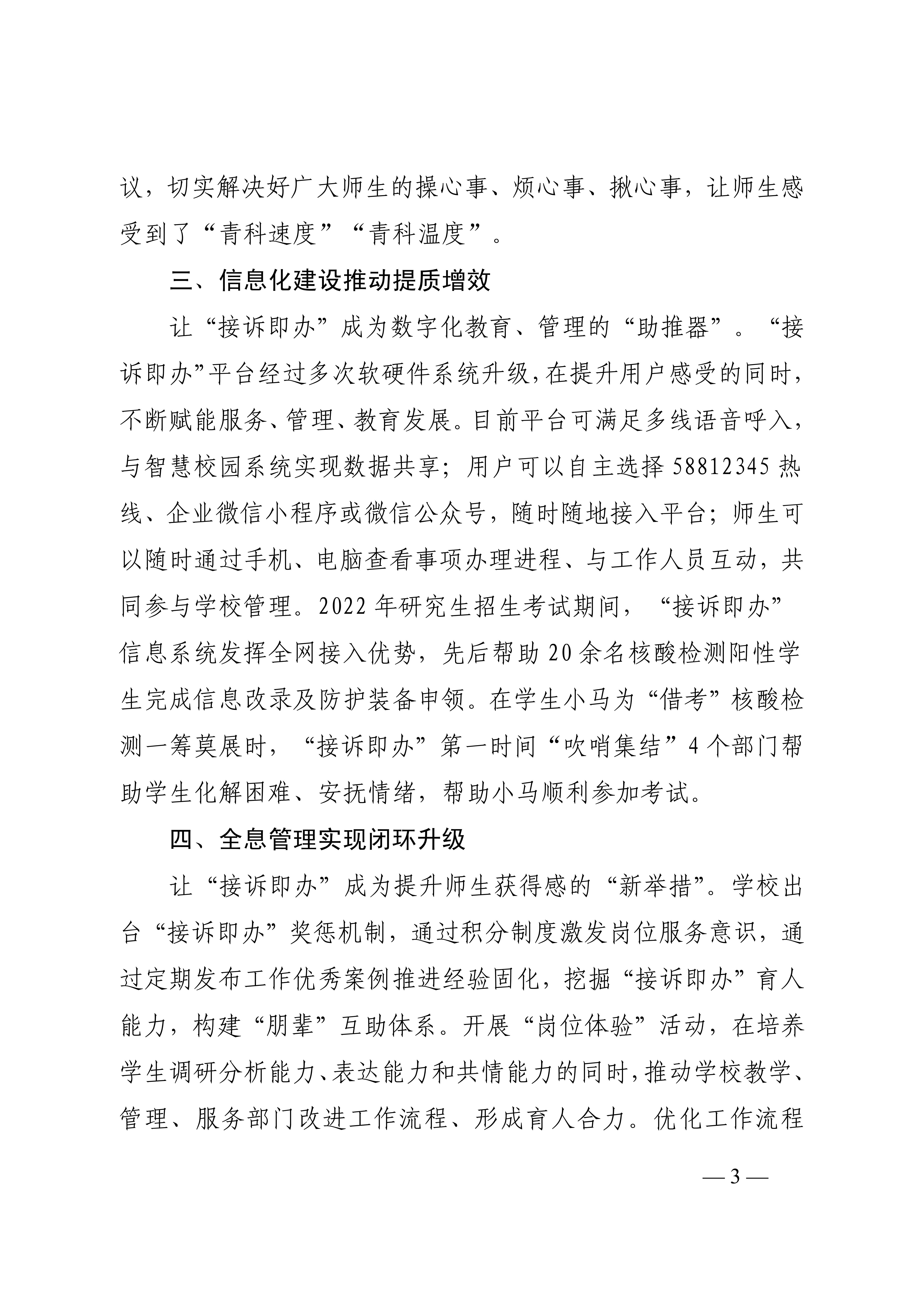 信息化建设推动提质增效。让“接诉即办”成为数字化教育、管理的 “助推器”。“接诉即办”平台经过多次软硬件系统升级,在提升用户感受的同时,不断赋能服务、管理、教育发展。目前平台可满足多线语音呼入,与智慧校园系统实现数据共享;用户可以自主选择58812345热线、企业微信小程序或微信公众号,随时随地接入平台;师生可以随时通过手机、电脑查看事项办理进程、与工作人员互动,共同参与学校管理。2022年研究生招生考试期间,“接诉即办”信息系统发挥全网接入优势,先后帮助20余名核酸检测阳性学生完成信息改录及防护装备申领。在学生小马为“借考”核酸检测一筹莫展时,“接诉即办”第一时间“吹哨集结”4 个部门帮助学生化解困难、安抚情绪,帮助小马顺利参加考试。