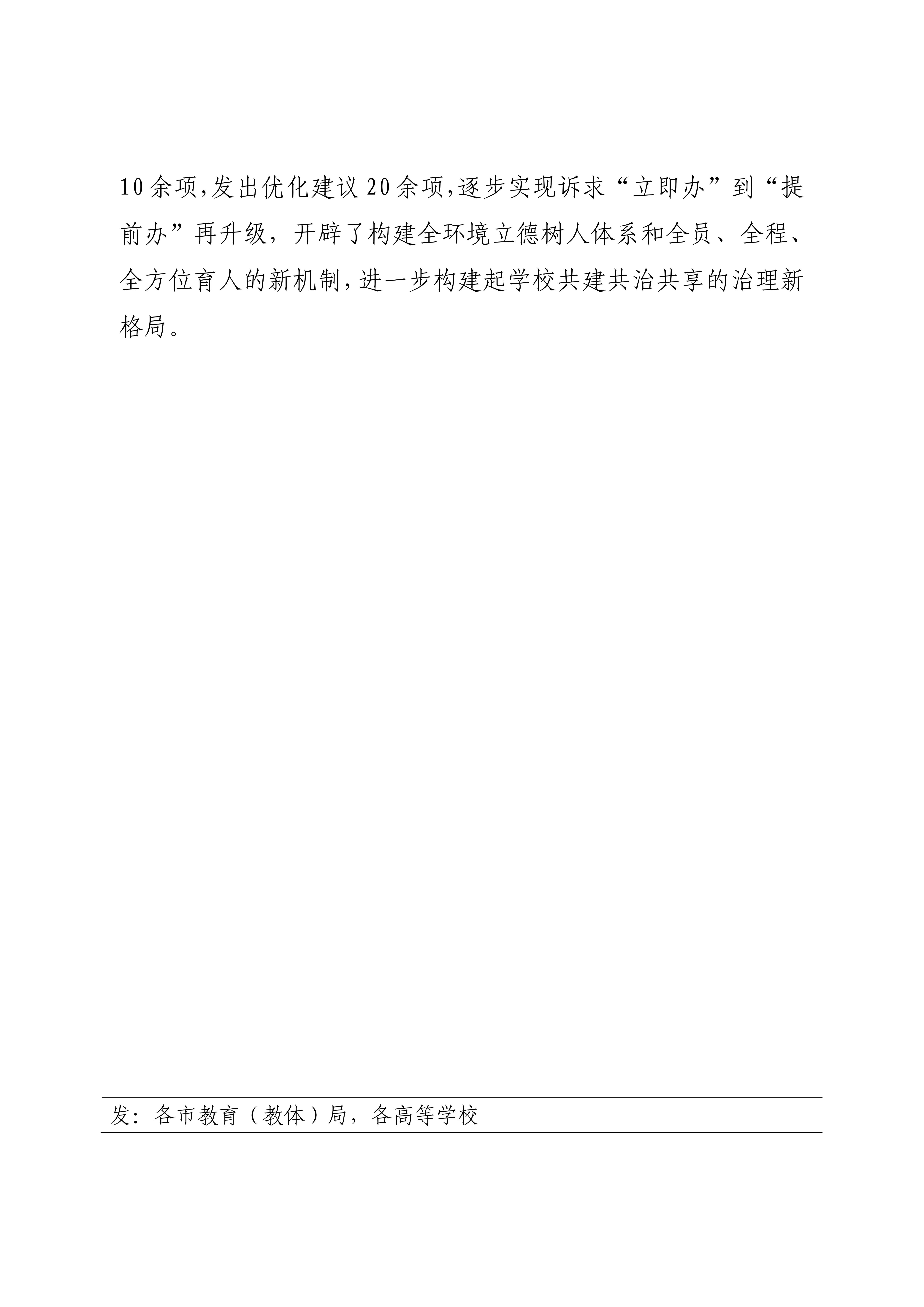 全息管理实现闭环升级。让“接诉即办”成为提升师生获得感的 “新举措”。学校出台“接诉即办”奖惩机制,通过积分制度激发岗位服务意识,通过定期发布工作优秀案例推进经验固化,挖掘“接诉即办”育人能力,构建“朋辈”互助体系。开展“岗位体验”活动,在培养学生调研分析能力、表达能力和共情能力的同时,推动学校教学、管理、服务部门改进工作流程、形成育人合力。优化工作流程10余项,发出优化建议20余项,逐步实现诉求“立即办”到“提前办”再升级,开辟了构建全环境立德树人体系和全员、全程、全方位育人的新机制,进一步构建起学校共建共治共享的治理新格局。