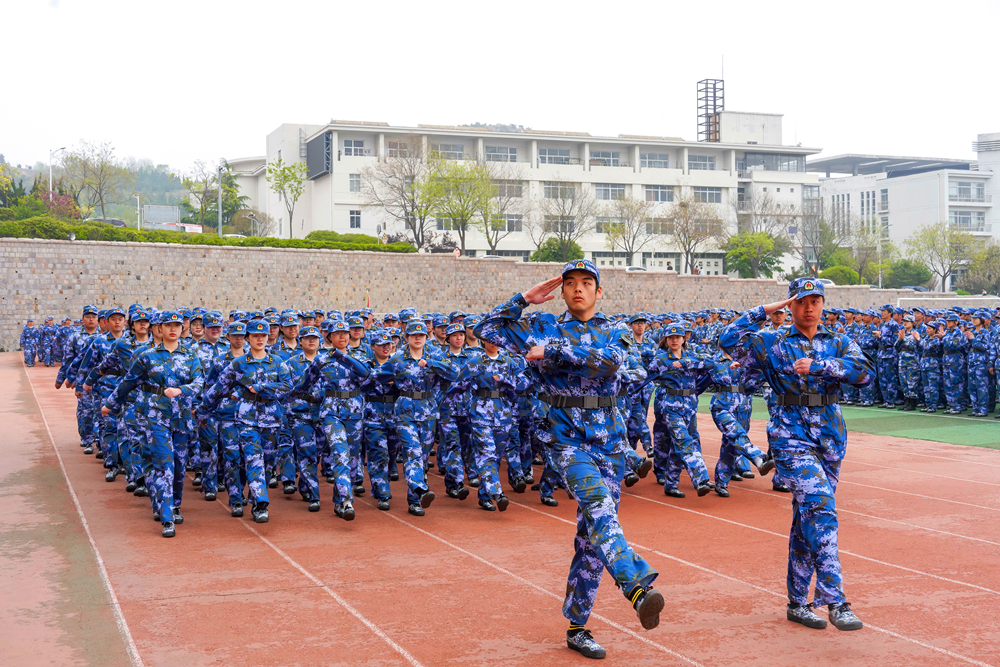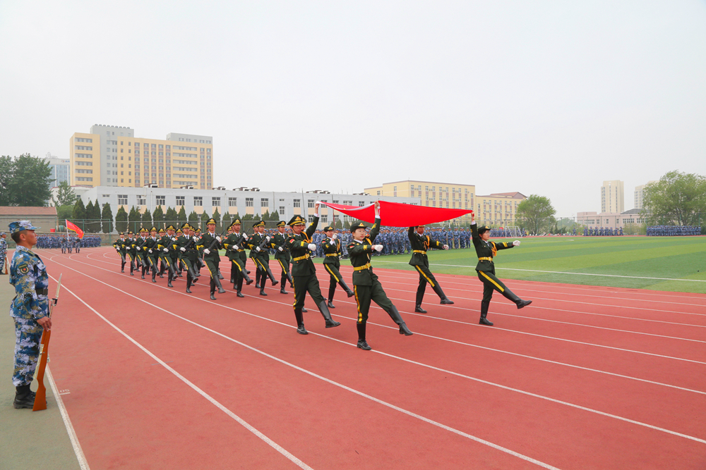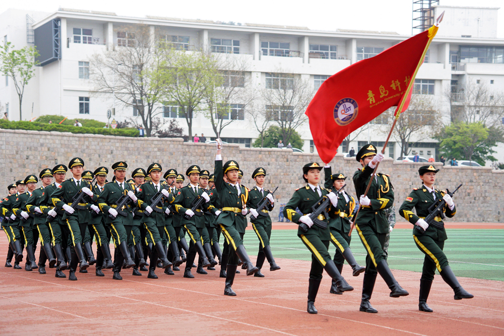 在分列式环节,各方阵呼号嘹亮、步伐坚定,展现了优异的训练成果,体现了青科大学子良好的精神风貌。