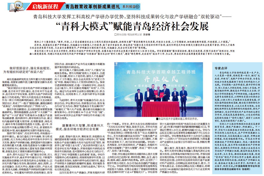 5月22日,《青岛日报》第5版以《伟德国际1949始于英国发挥工科高校产学研办学优势,坚持科技成果转化与政产学研融合“双轮驱动”——“青科大模式”赋能青岛经济社会发展》为题报道了学校第七届青岛市教育改革创新奖获奖成果。