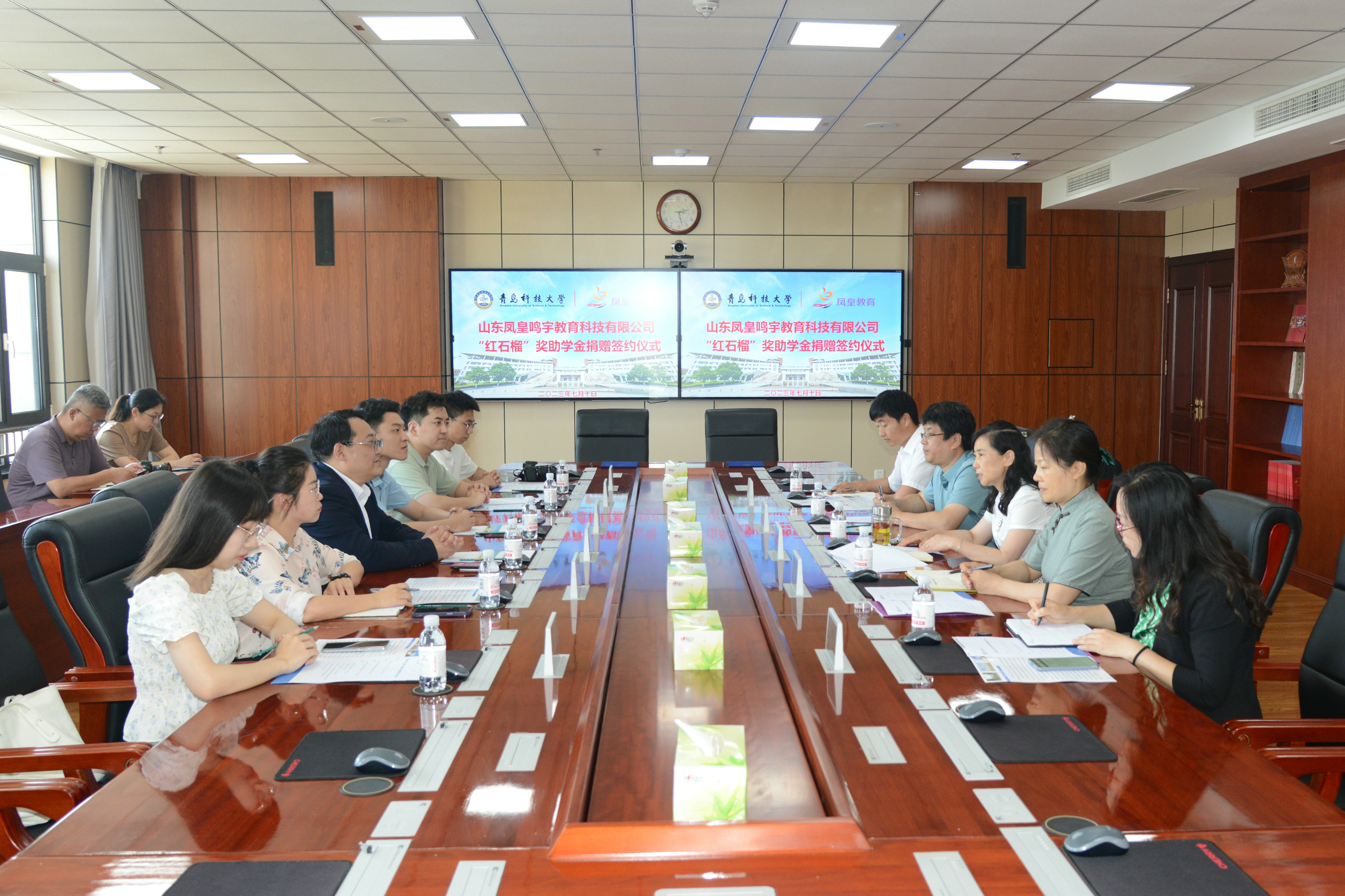 7月10日,凤皇教育“红石榴”奖助学金捐赠签约仪式在崂山校区举行。学校党委副书记沈文青,凤皇教育校长王宝玉,党委常委、统战部部长秦姣出席仪式。仪式由校友工作办公室(教育发展基金会)主任王泽鹏主持。