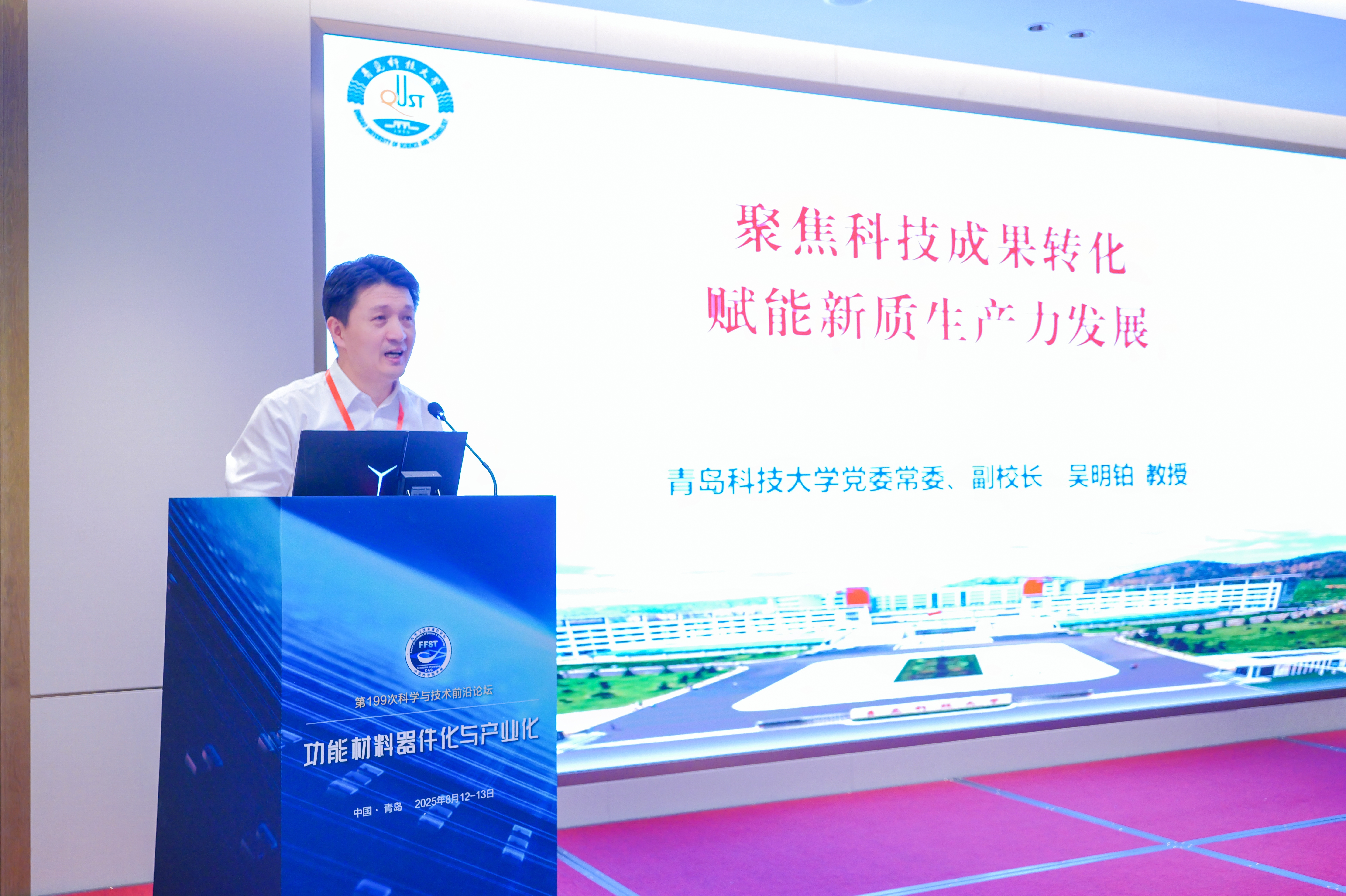 陈克正在致辞中对参会专家表示欢迎,并感谢大家长期以来对青科大的关心支持。他表示,功能材料作为新材料领域的核心,是推动现代高新技术产业发展的关键。近年来,学校锚定“两服务一引领”发展战略,立足化工、材料等学科优势特色,打造高能级科研平台,在推动科技成果转化上取得了显著成果。下一步,学校将持续开展功能材料等领域研究,推动科技创新与产业创新深度融合,打造“青科大模式”升级版。此次论坛搭建了功能材料领域学术交流的广阔平台,希望与会专家学者集思广益、传经送宝,为功能材料器件化与产业化的创新突破注入新动能,助力科技强国建设。